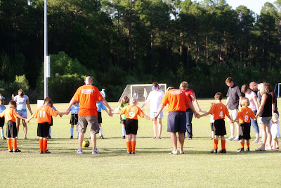 This is our team praying before the game tonight. All the families join in and it's truly an awesome way to kick things off (pun intended!). I really can't say enough good things about the Y's athletic program...but that's not the focus of this post, so I'll move on. :-)